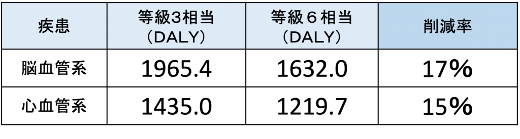1. 25歳以上の脳血管系疾患(脳梗塞・脳出血など)*2について、「断熱等性能等級3相当」と「断熱等性能等級6相当」を比較した結果、DALY*1は17%削減される可能性があると推計されました*3。