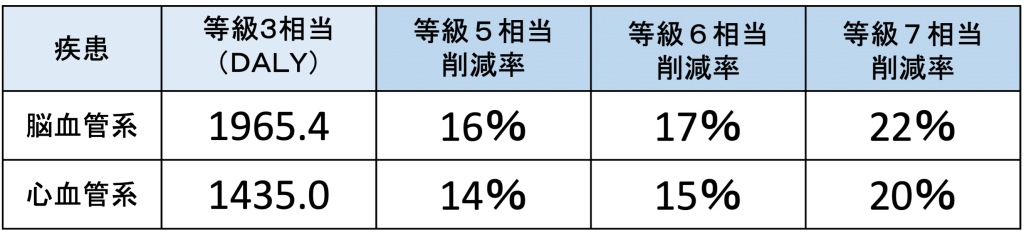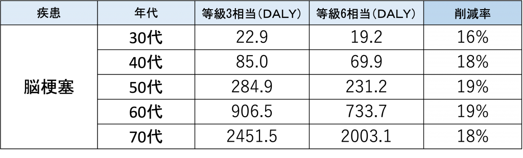 3. DALY削減率*3を年齢層(男性)ごとに比較すると、例えば脳梗塞では、30歳代の16%に対して、50歳代・60歳代では19%と高い結果となり、高齢層ほど健康損失期間の削減効果が大きくなる傾向が見られました。